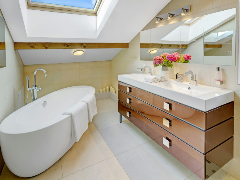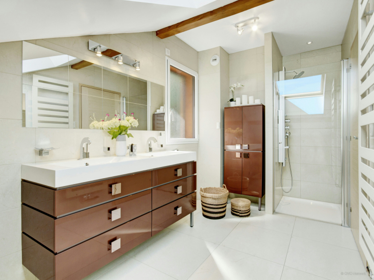 The villa has a shower room on the ground floor, a bathroom on the first floor and another shower room downstairs near the relaxation area (sauna). There are also separate toilets.