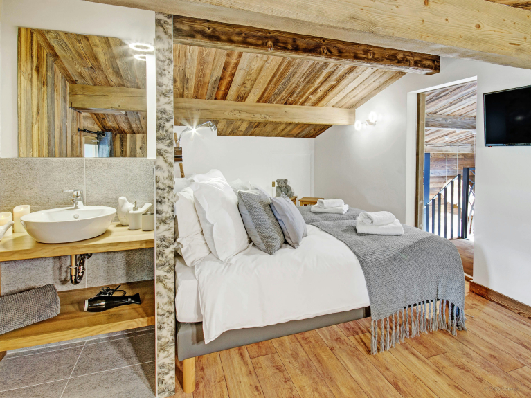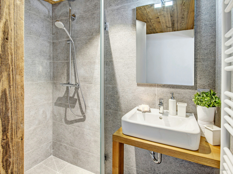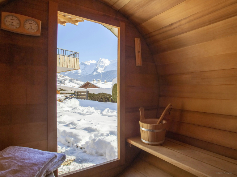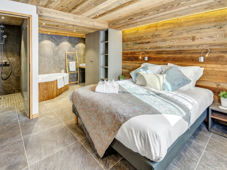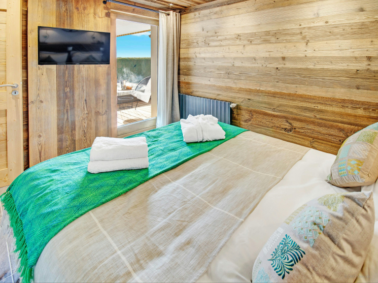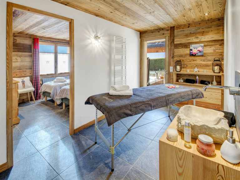 It sleeps 14 people (12 adults maximum) in 6 bedrooms: the first three are on the first level, where the ski room, garage and laundry room are also located, as well as a massage table and dressing room. You will have access to a beautiful sunny terrace with jacuzzi, to relax while watching the sun disappear behind the peaks...