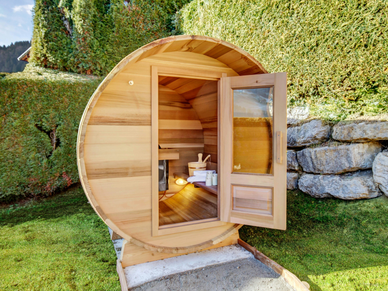 Two additional bedrooms, with bathrooms, are located on the first floor. The living area has a fully equipped kitchen and a large dining table, where all guests can share their meals. In front of a magnificent fireplace, the warm living room invites to convivial moments. An elegant staircase leads you to the mezzanine, where you will find the sixth bedroom with bathroom, the TV/game room, a library and an office. The secure garden will allow children to play in peace. The sauna, in the shape of a barrel, is installed at the bottom of the garden.