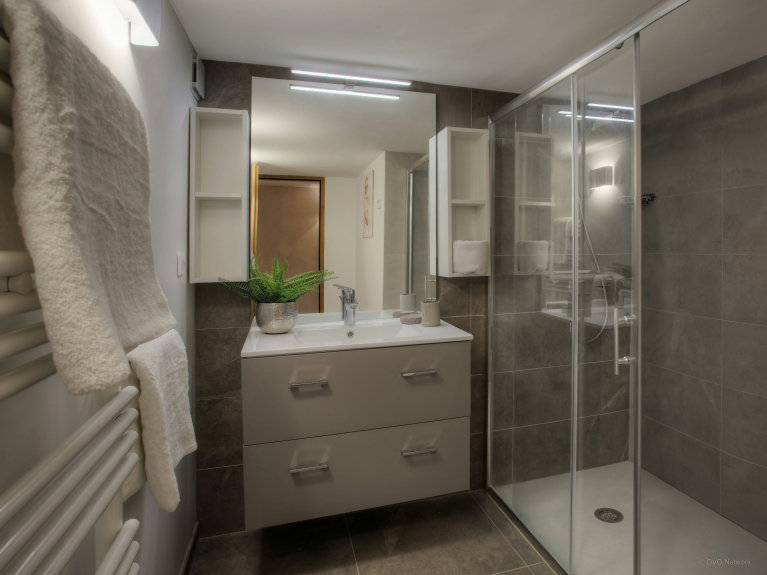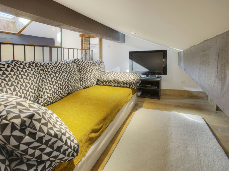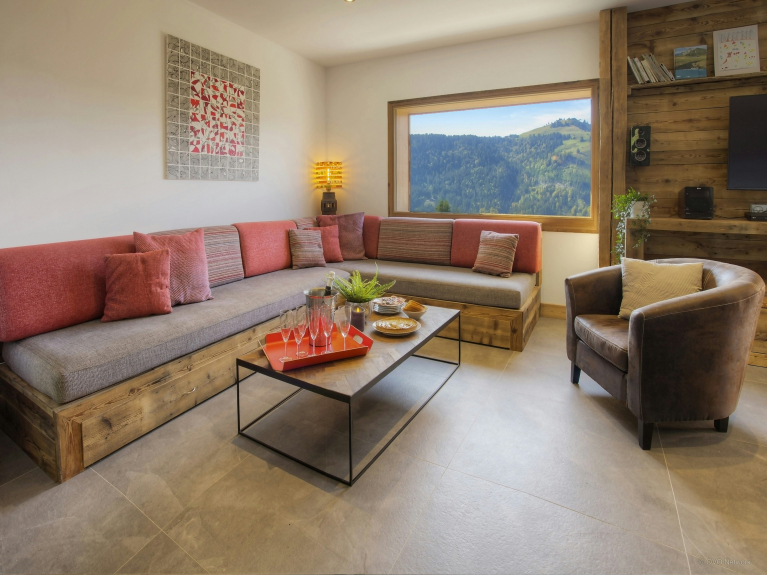 The accommodation is spread over four levels. The top floor, under the roof, has twin bedrooms and a TV lounge. Teenagers will make this their home. A sun terrace has been created at the front of the house and a shaded terrace in the garden overlooking the forest. You enter Chalet Zamaro from the beautiful sun terrace on the ground floor. In the entrance hall, you will have space to hang your coats and have access to the ski room, very practical to store your equipment. A lovely bedroom with double bed, shower room and separate toilet is also located on this level. Its doors open onto the terrace from where you can admire the beautiful view of the Beauregard plateau. It is a charming place to drink your coffee in the morning.