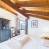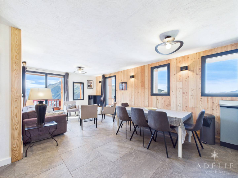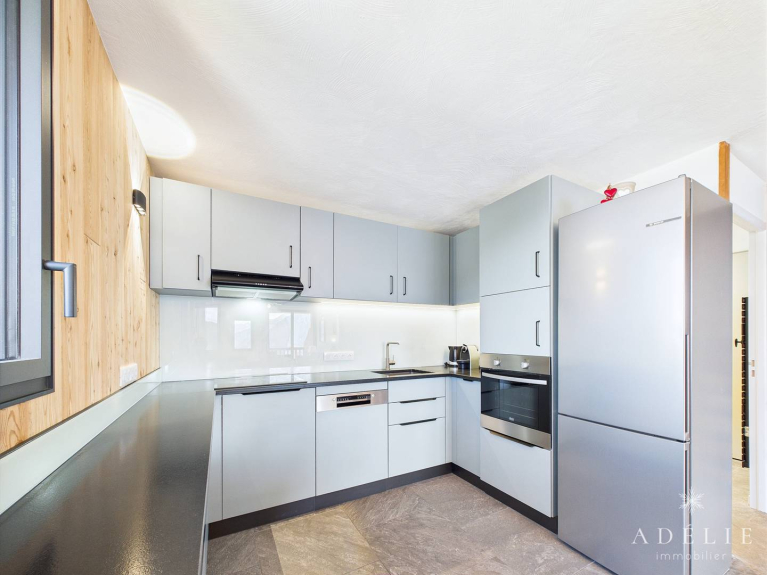 Large living room/kitchen of 35m² with equipped kitchen: dishwasher, oven, ceramic hob, refrigerator.