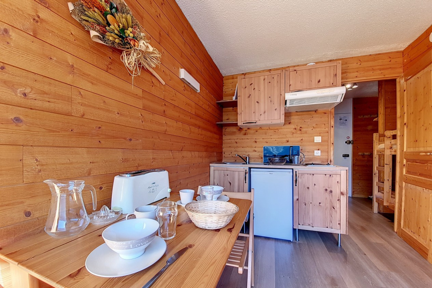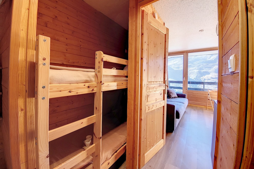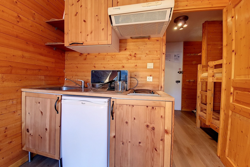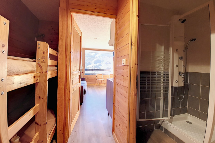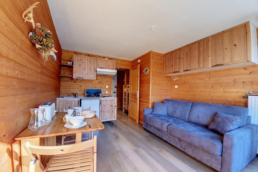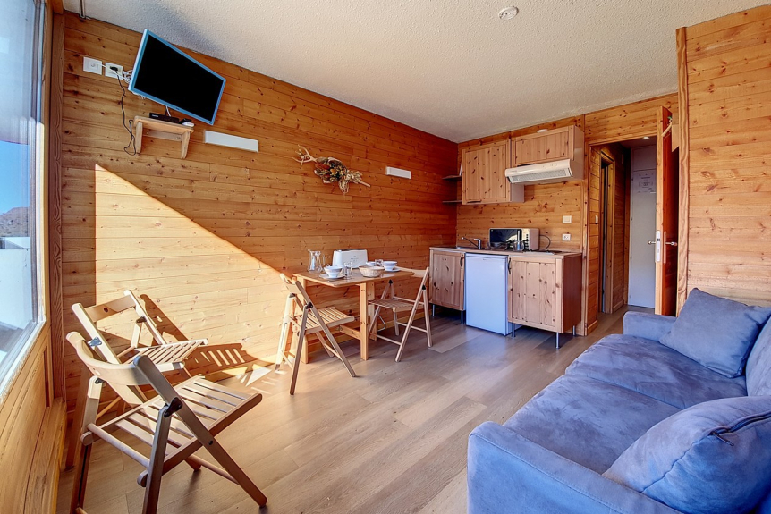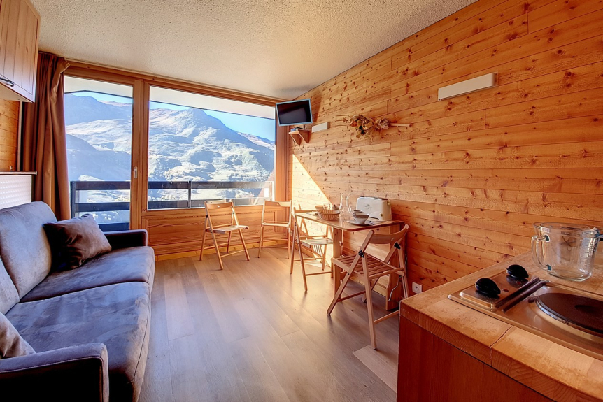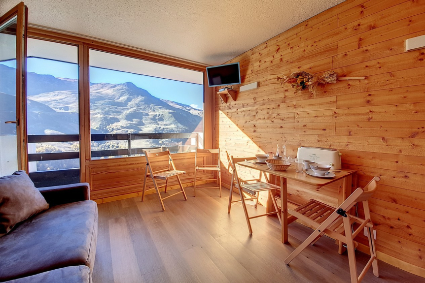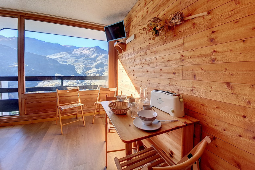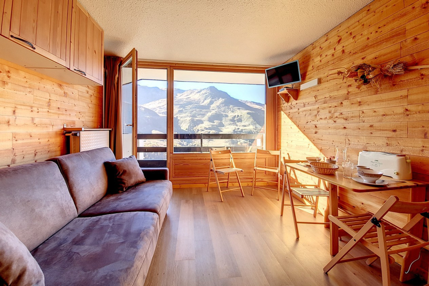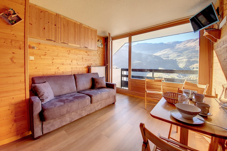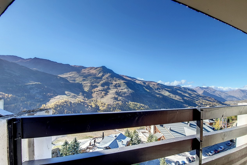 Studio with mountain corner of 18 m² completely renovated for 3 people. It is located on the 8th floor of a residence with elevator and has a small balcony facing North-West (Masse view).