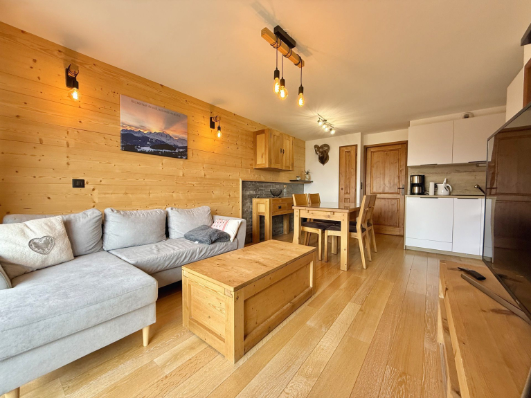 Located in Tovet, 5 min walk from the village and next to the ski slopes, apartment of 50m² on the 1st floor of a charming residence. Its balcony/terrace facing SOUTH/WEST offers a superb view on the Mont Charvin and the surrounding mountains.