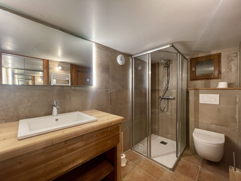 *1ST LEVEL: laundry room with washing machine/dryer, and solarium terrace facing Mont Charvin. Bathroom with walk-in shower (caution, ceiling height <1.90m). Access to upper floor via spiral staircase.