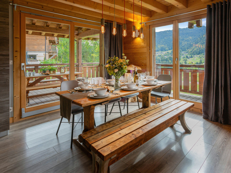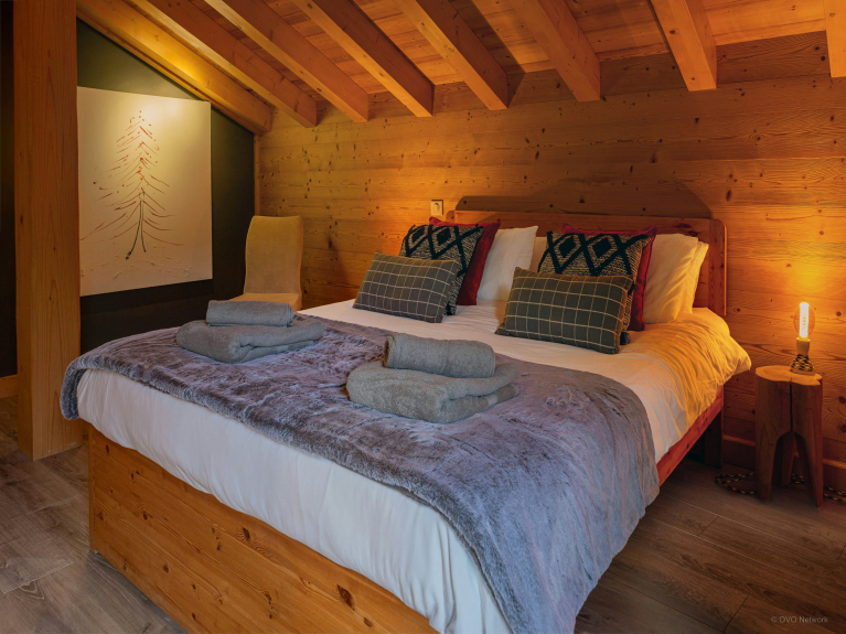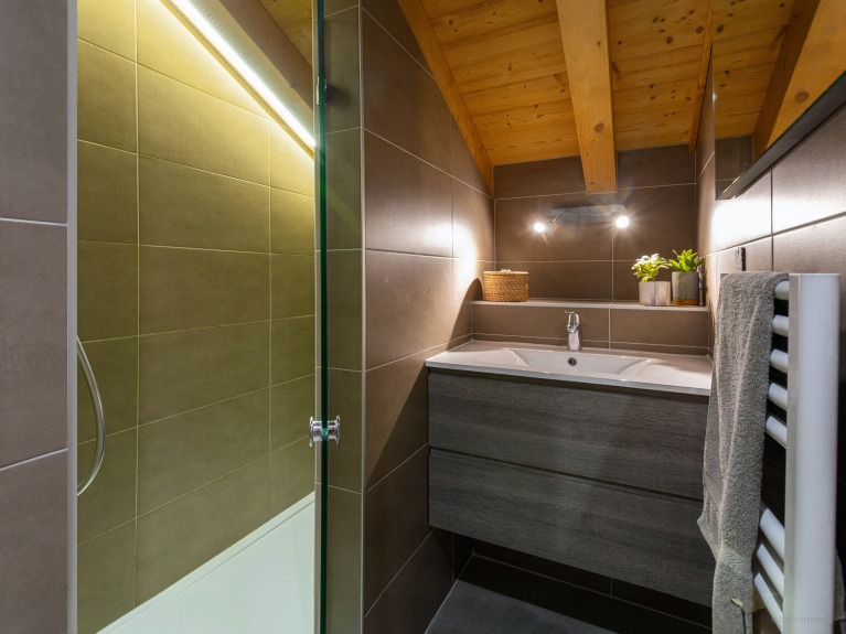 There are 4 double rooms with en suite bathrooms, 3 of which can also be converted into twin rooms. Some have direct access to a balcony or terrace. With 2 bedrooms on the garden level and another 2 on the upper floor, this chalet is ideal for two families wishing to stay together in the mountains while retaining their personal space.