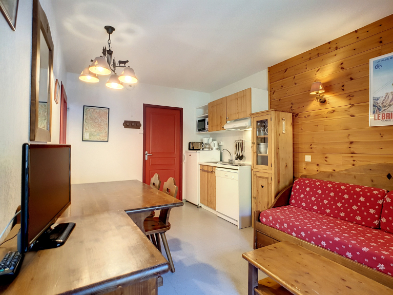 Attractive, comfortable apartment in a slopeside residence in the Pelvoux resort. South-facing, 1 bedroom, 1 mountain corner with bunk beds, bathroom, separate toilet and balcony.