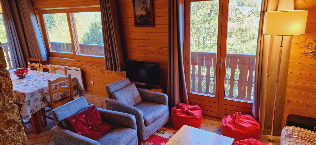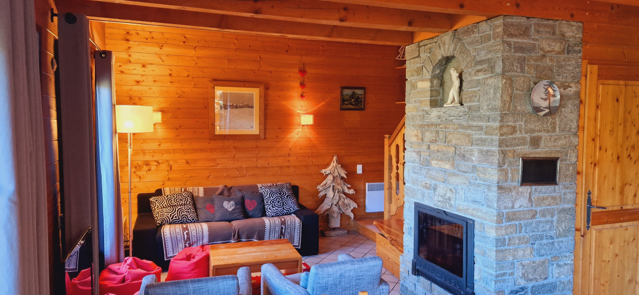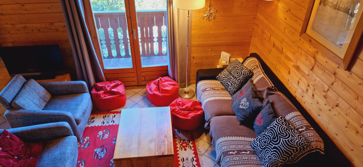 Individual chalet with 3 bedrooms + mezzanine, located very close to the heart of the resort. Composed of 2 floors, 110m², with parking space in front of the chalet, it faces south-west with a magnificent view of the valley and Mont Blanc.