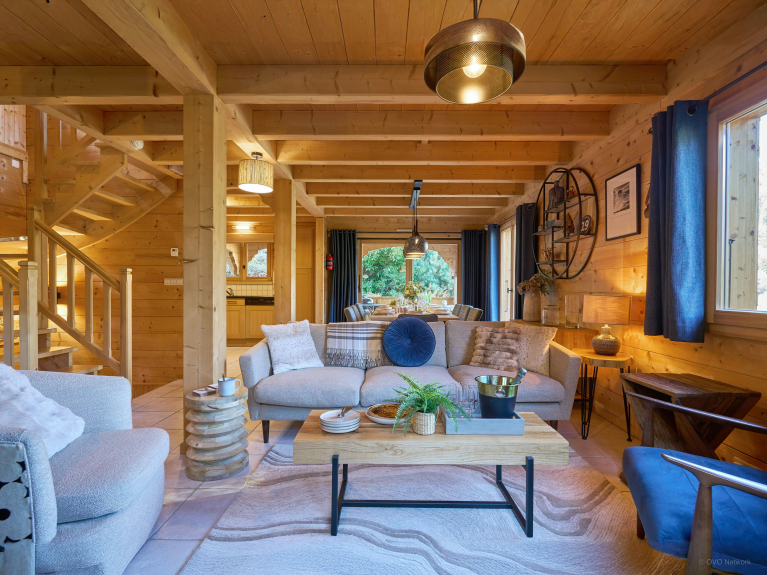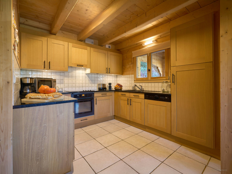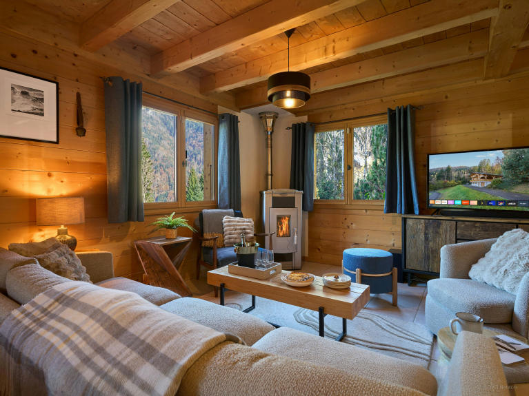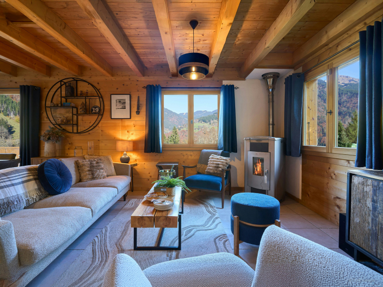 The open-plan living area takes full advantage of the panoramic views, thanks to three French windows opening onto a panoramic terrace. It includes a large living room with TV and wood-burning stove, and a pleasant reading room. The compact kitchen is fully equipped, including a dishwasher.