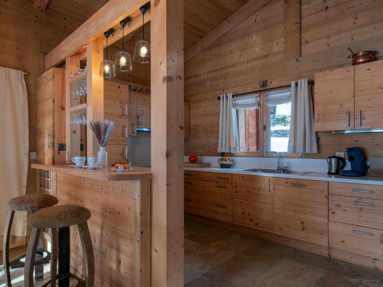 For your meals, you can choose between the dining room and fully-equipped kitchen, or the beautiful south-facing terrace with its views of the slopes.