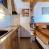 An open-plan kitchen equipped with fridge with freezer compartment, mini-oven, microwave, dishwasher, induction hob and extractor hood.