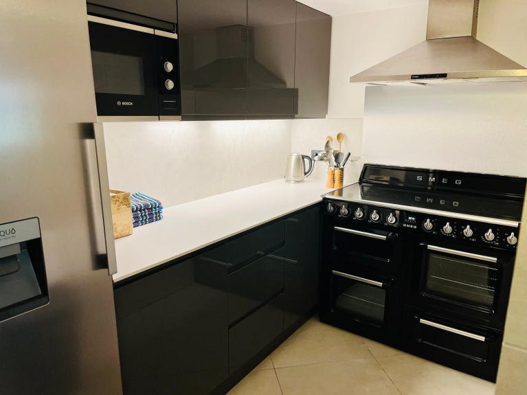 Equipped kitchen opening onto living room.