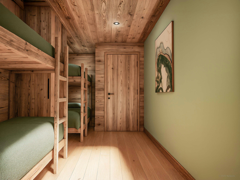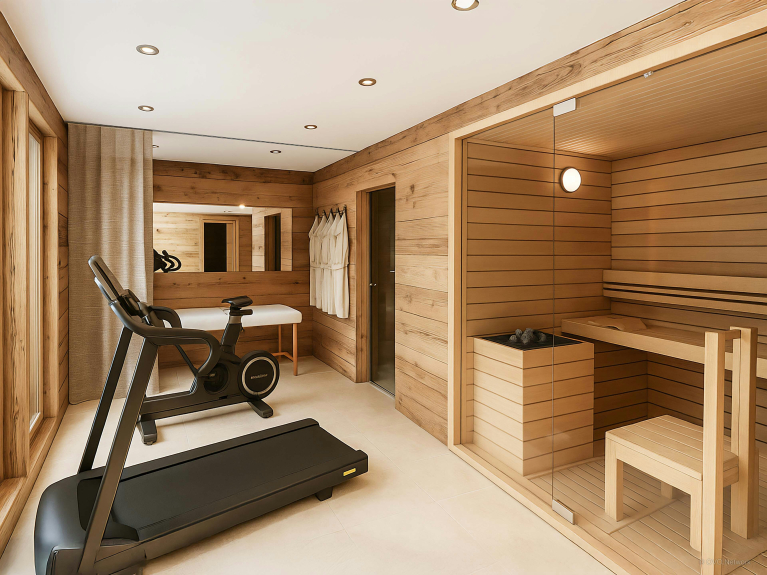 On the lower floor, you'll find five double bedrooms and a dormitory for four, perfect for children. This is also where you'll find the chalet's wellness area: sauna, hammam, as well as a gym that opens onto an outdoor terrace.