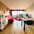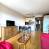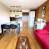 - Open-plan kitchen: two-burner induction hob, microwave/grill, fridge with freezer compartment, dishwasher
