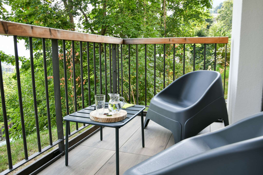 Enjoy unobstructed views from the furnished balcony, perfect for relaxing.