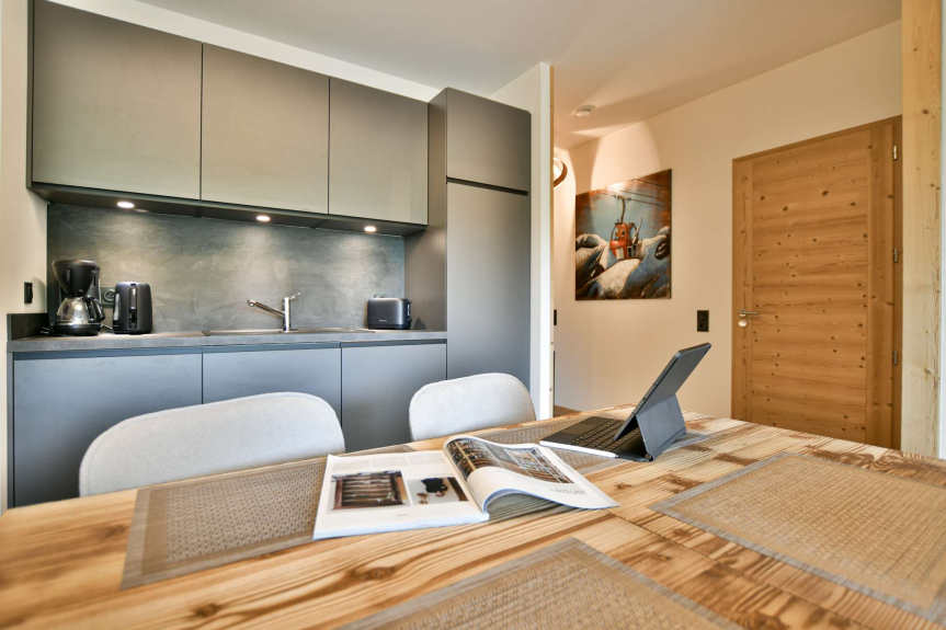 The fully equipped kitchen allows you to prepare meals just like at home. The apartment also features a bathroom, a separate toilet, a ski locker, and a dedicated outdoor parking space.