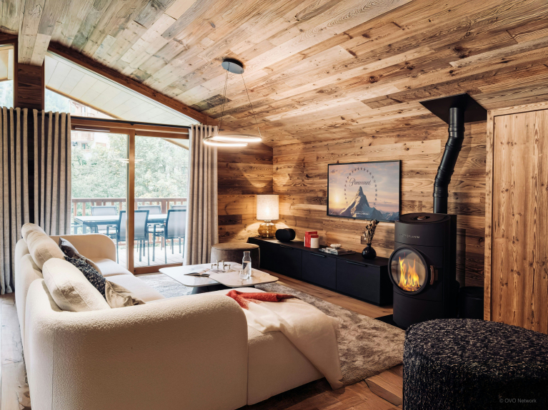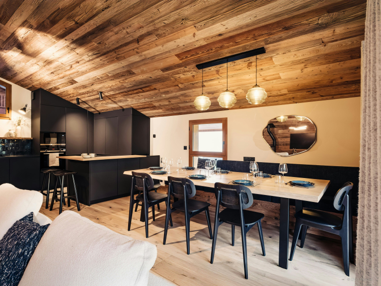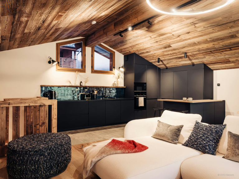 Upstairs, natural light highlights the beauty of the living space. The living room is laid out opposite a TV and wood-burning stove, while the modern kitchen, with its central countertop, opens onto a convivial dining table. On the balcony, a dining and relaxation area invites you to enjoy the serenity of the Alpine panorama.