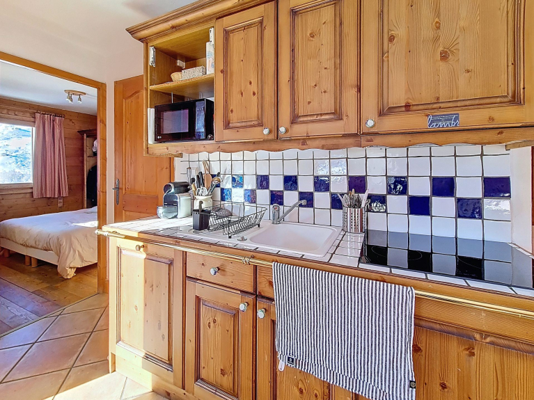 This residence, located at the entrance to the resort, captivates with its traditional Savoyard style. Come and discover its functional apartments, relaxation area with swimming pool, sauna, hammam, fitness room, ski store and free shuttle service to the resort center, 1km away.