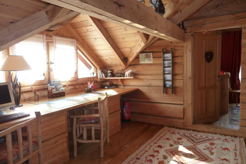 In a chalet in solid wood, with a lot of charm and careful decoration, in a condominium of 3 persons with independent entrance, the apartment is arranged as follows: Independent glazed entrance leading to the ski room and the apartment. On the ground floor, an entrance, a bedroom with a 160 cm bed and a shower room, a living room, a dining room, an American kitchen, a storeroom, an independent WC, a balcony. On the first floor, a bedroom with 2 beds in 160 cm and a shower room, a bedroom with a bed in 160 cm and another bedroom with a bed in 160 cm in mezzanine, an office, a bathroom, a reading corner with another TV screen, and an independent WC.