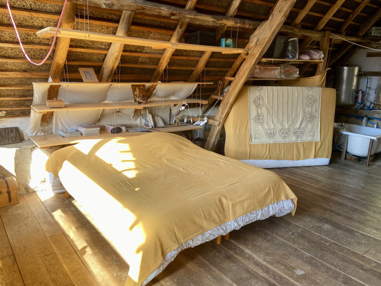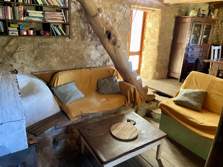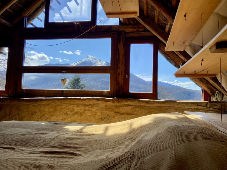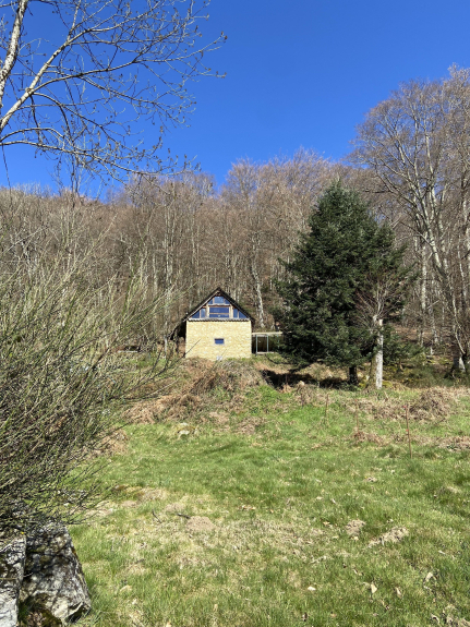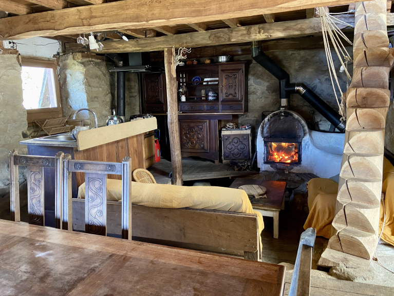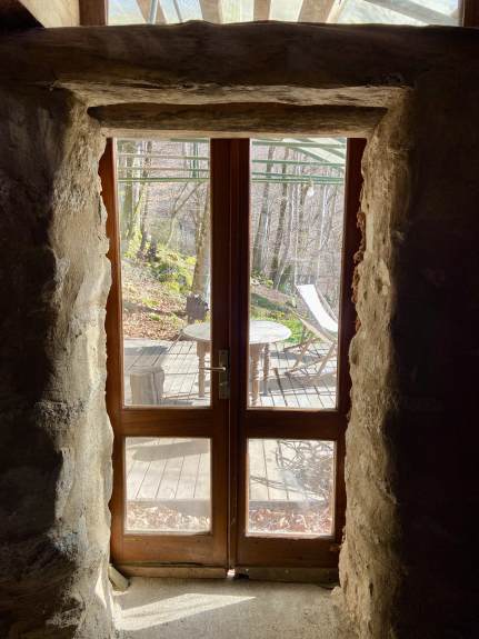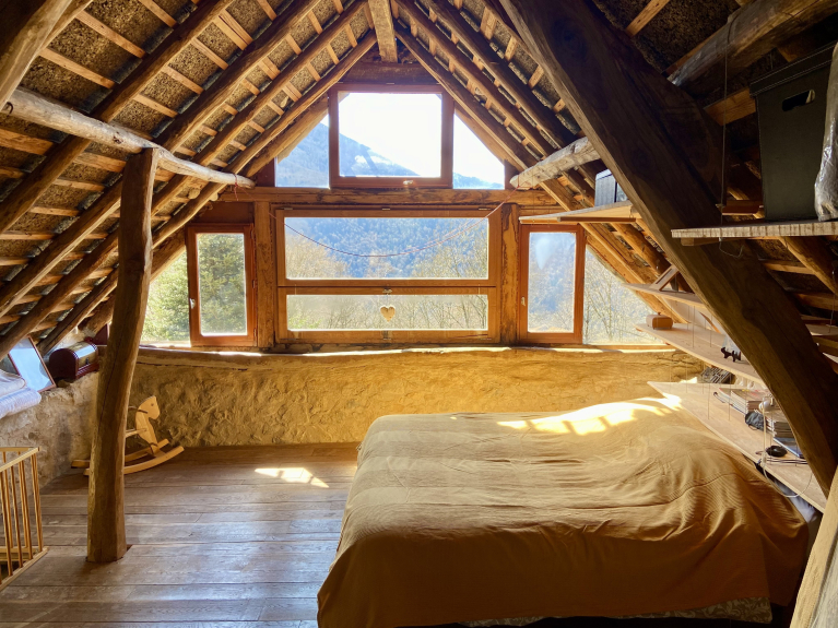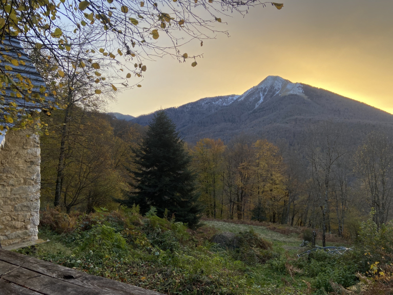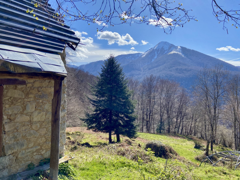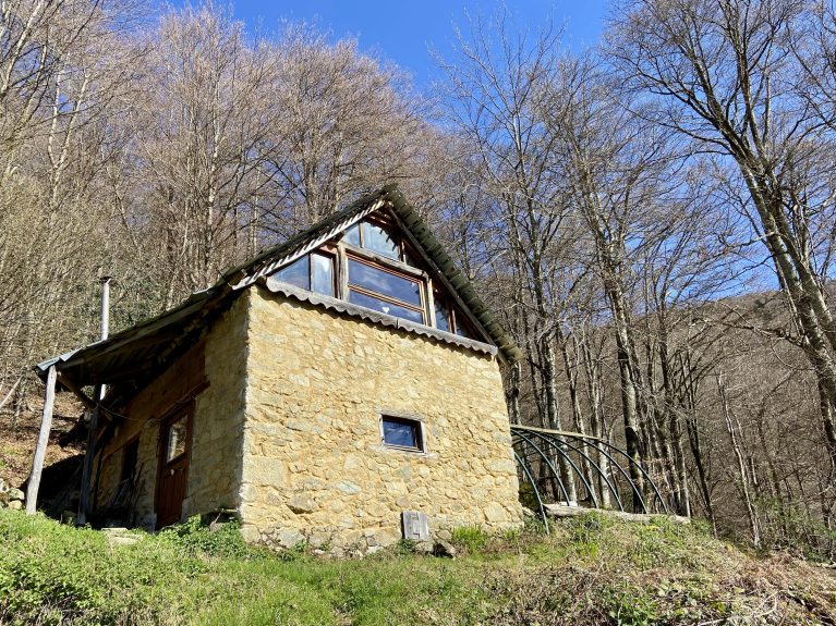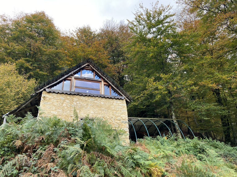 Un granero reconvertido en cabaña de trampero, en un claro aislado en el corazón del bosque, frente a las montañas, en el GR 78.