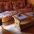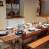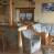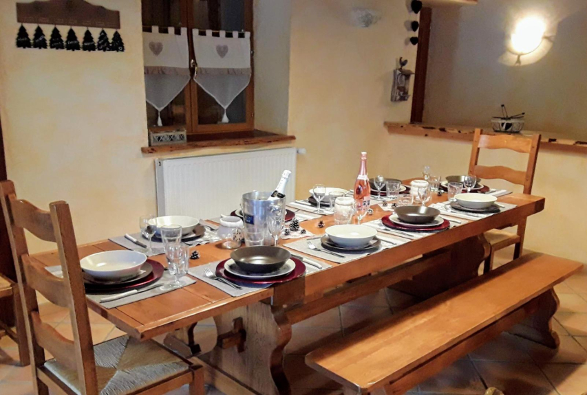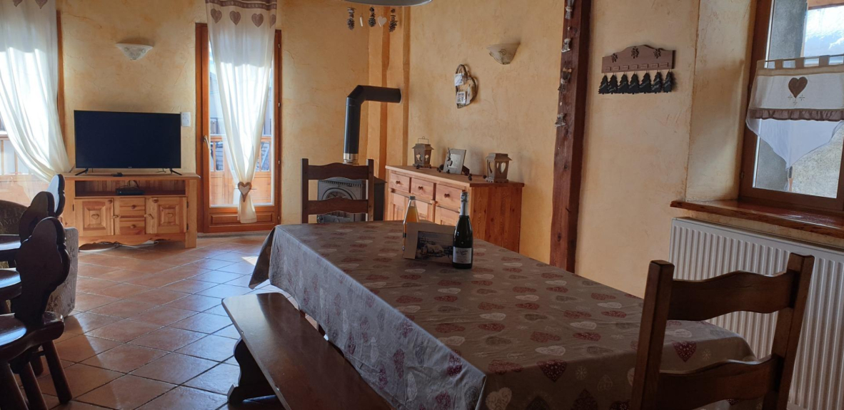 el comedor (sofá cama para 2 personas) y gran mesa de madera con posible extensión abierta en la cocina y el balcón con vistas a la estación y el pueblo