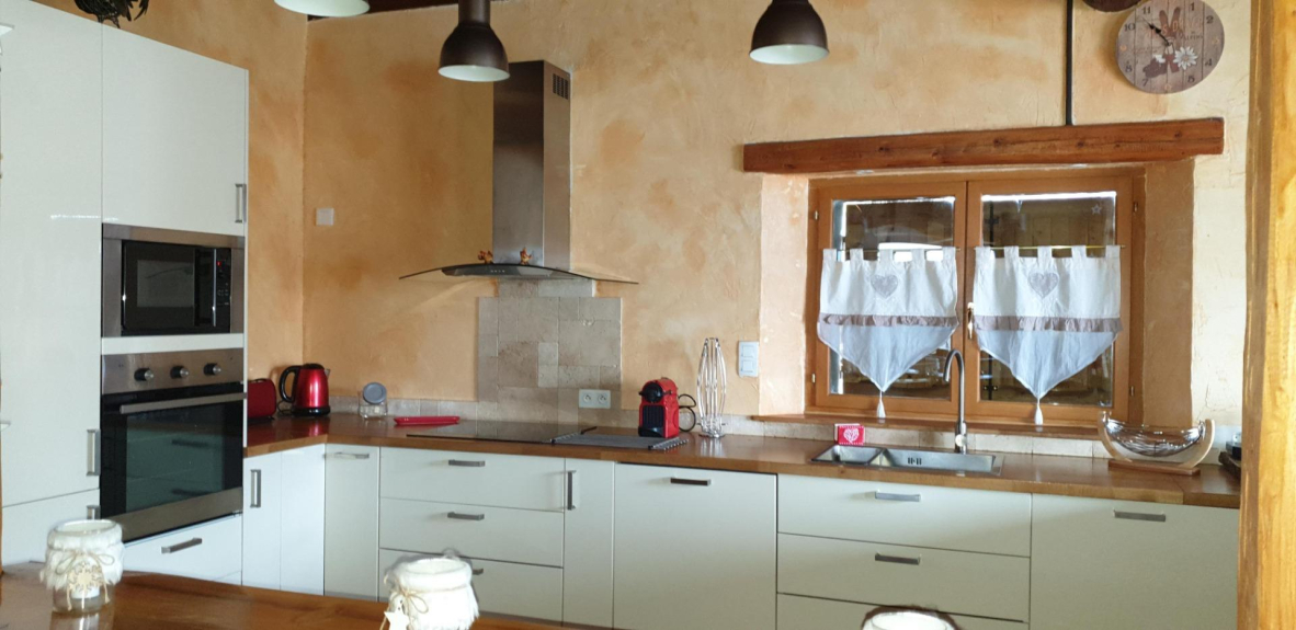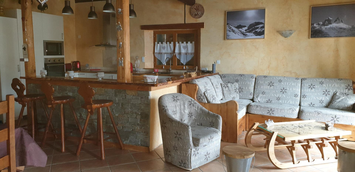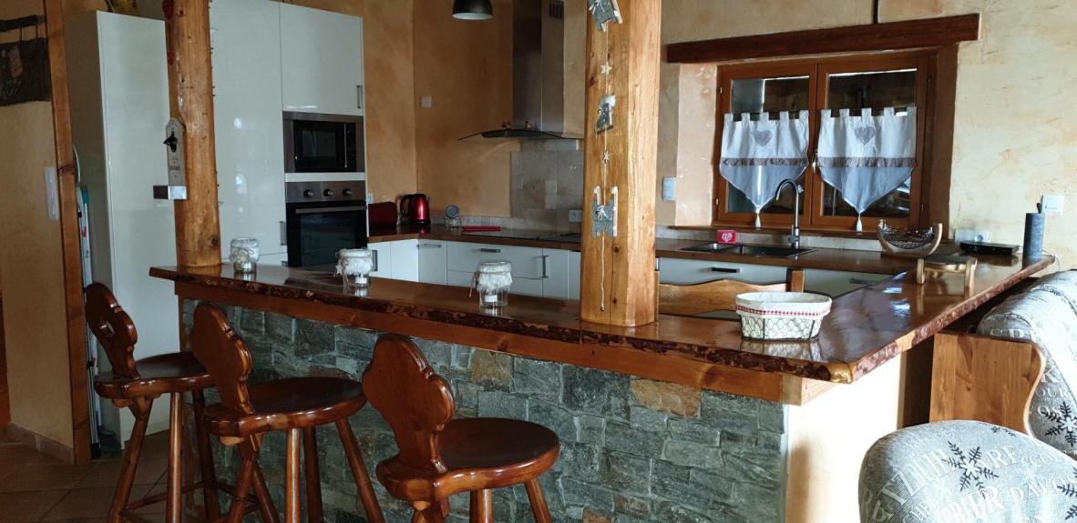 1 cocina abierta totalmente equipada con frigorífico-congelador, horno, microondas, placa de inducción, lavavajillas, lavadora (cafetera nespresso, cafetera tradicional, tetera, hervidor, tostadora, máquina de raclette y pierrade, máquina de fondue, olla a presión, prensa de cítricos, batidora eléctrica, batidora de mano ....)