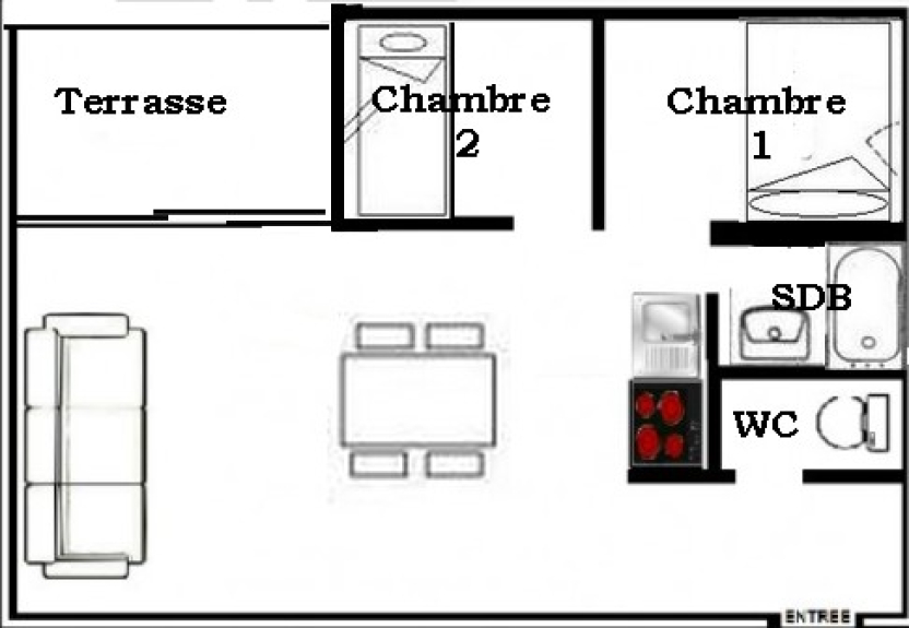 Piso de 3 habitaciones para 6 personas, 30m², situado en la 1ª planta. Balcón orientado al norte, pero que ofrece una magnífica vista de la cordillera.
