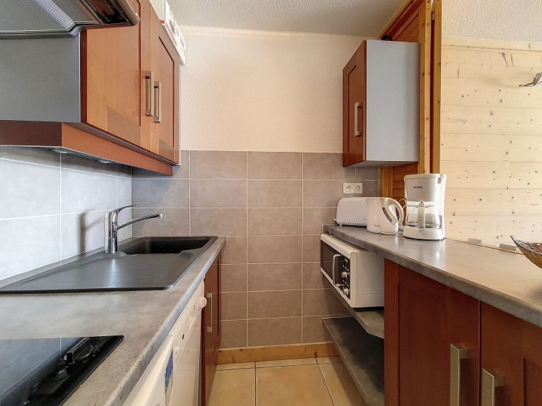 Cocina independiente con 2 placas de vitrocerámica, horno microondas combinado, frigorífico y lavavajillas, tostadora, hervidor y cafetera