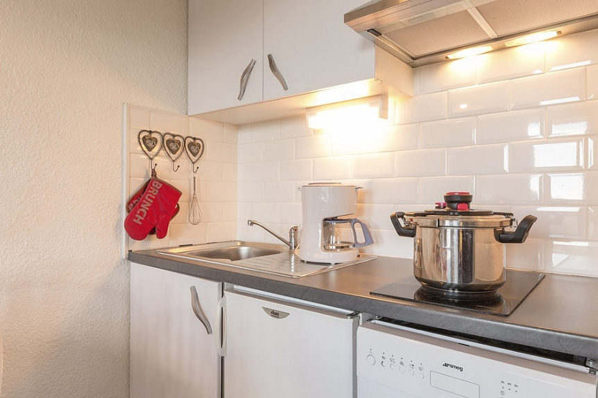 Cocina equipada con 2 placas eléctricas, mini-horno, nevera, lavavajillas, cafetera, tostadora y hervidor de agua, máquina de raclette.