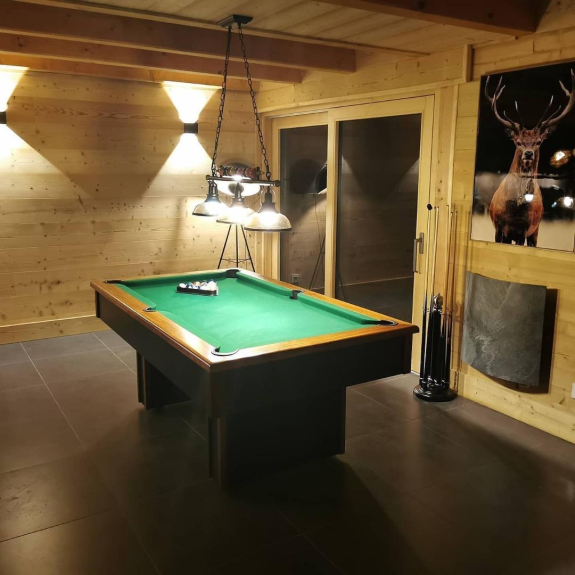Un jacuzzi al aire libre, sauna con ducha, gran sala de estar con mesa de billar, cocina abierta totalmente equipada, un gran sofá en forma de U, TV OLED de pantalla grande, PS4, sistema de alta fidelidad, (estufa de chimenea) sala de esquí con lavandería y secadora. ¡Mesa para 12 personas!