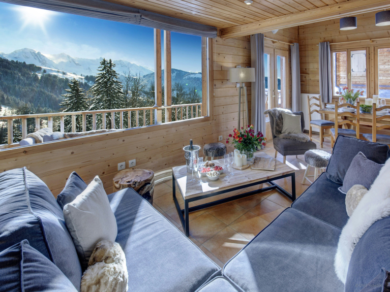 El salón se abre a un balcón amueblado y a una terraza, perfecta para desayunar al sol o tomar un chocolate caliente o un vino de vuelta al chalet. La acogedora sala de estar es un lugar ideal para reunirse por las tardes y comentar las actividades del día en los sofás, mientras se admiran las fantásticas vistas desde el gran ventanal. ¿O prefiere relajarse en la bañera nórdica exterior, para desconectar después de un día ajetreado?