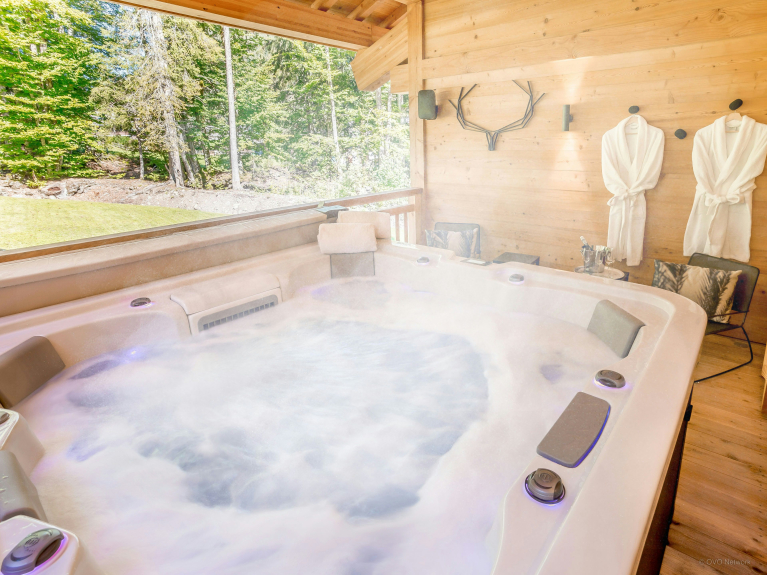 La zona de bienestar también se encuentra en este nivel, con una sauna con ducha, una terraza protegida con jacuzzi. Relájese viendo a los esquiadores hacer slalom entre los árboles.