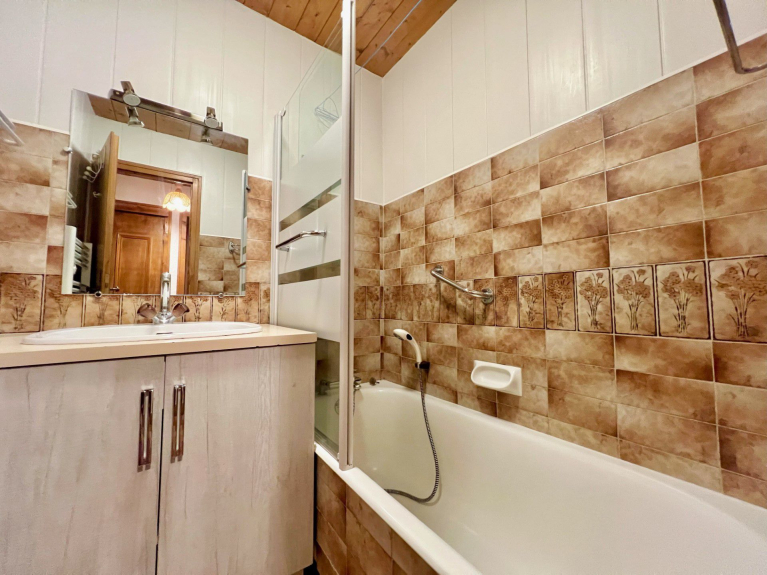 A los pies de las pistas del Espace Diamant, a 1350 m de altitud, un piso de 2 habitaciones + altillo (para adultos) situado en la 2ª planta con un balcón orientado al SUR que ofrece una magnífica vista de las pistas y las montañas.