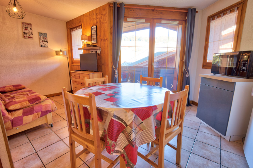 Piso de 23m² para cuatro o cinco personas, en el segundo piso de la residencia con un balcón ESTE. La residencia está situada frente a las pistas del Espace Diamant y el ESF.