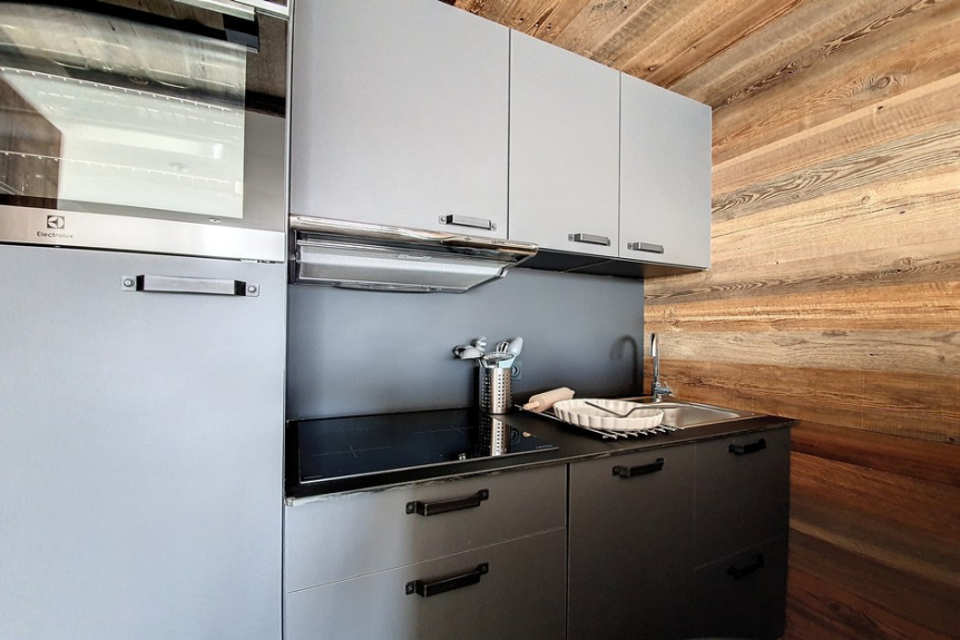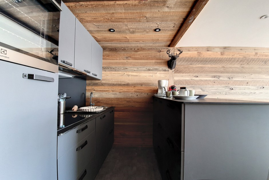 Cocina con 4 placas de cocción, horno, microondas, nevera, lavavajillas, tostadora, hervidor de agua y cafetera nespresso