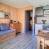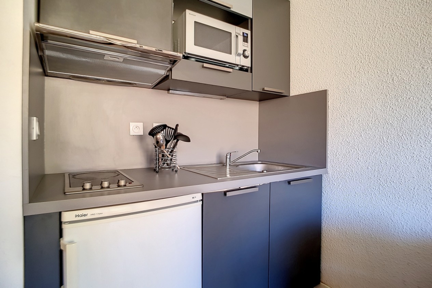Cocina integrada con 2 placas de cocción, microondas, nevera, tostadora, hervidor y cafetera Senseo.