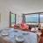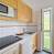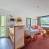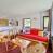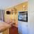Cocina integrada con 4 placas de cocción, nevera, horno, microondas, lavavajillas, hervidor, cafetera y tostadora.