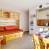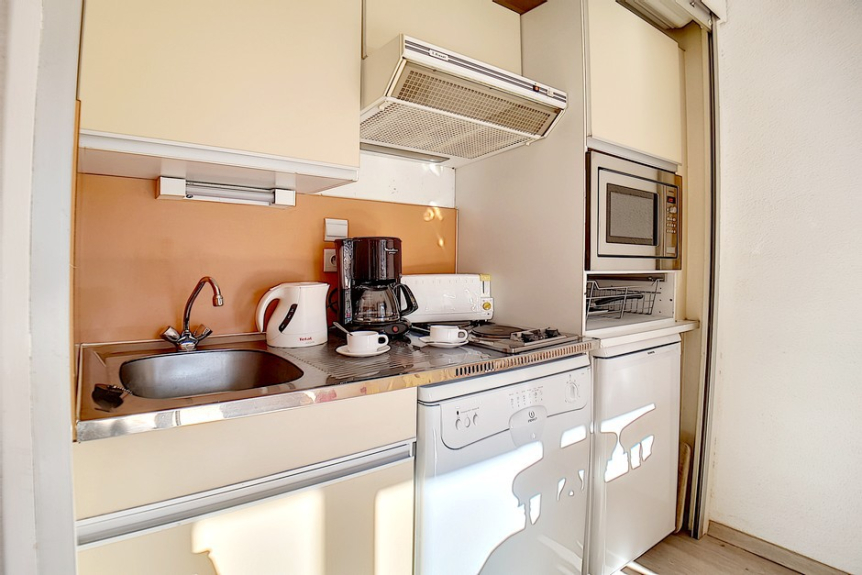 Cocina equipada con 2 placas de cocción, nevera, microondas, lavavajillas, cafetera, hervidor y tostadora.