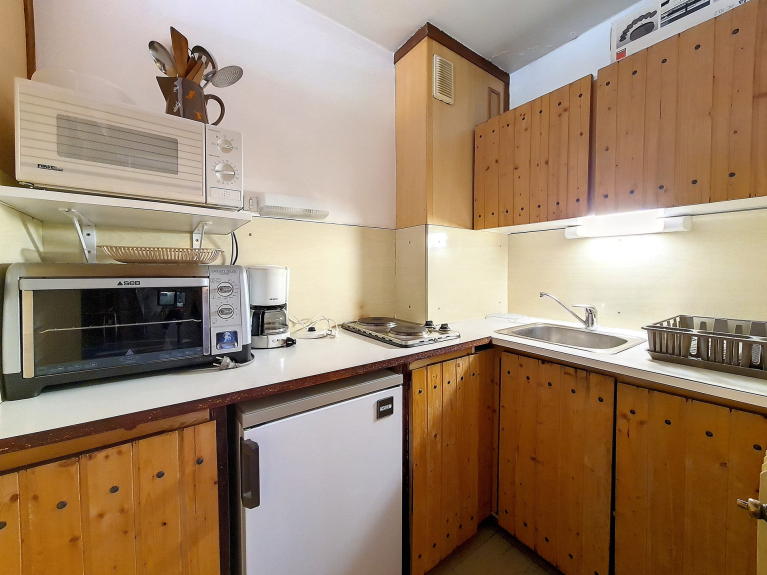 Cocina (cerrada) equipada con nevera, 2 placas eléctricas, microondas, horno tradicional, hervidor, cafetera y tostadora.