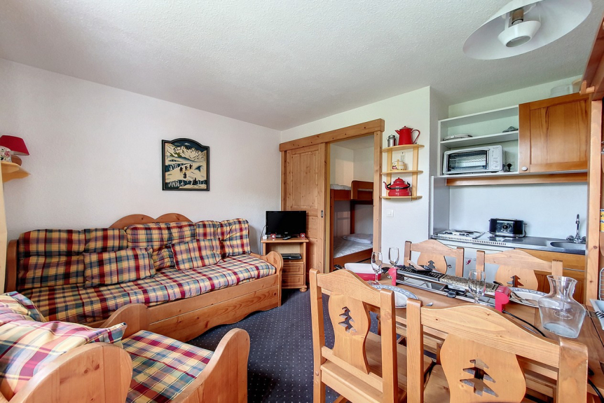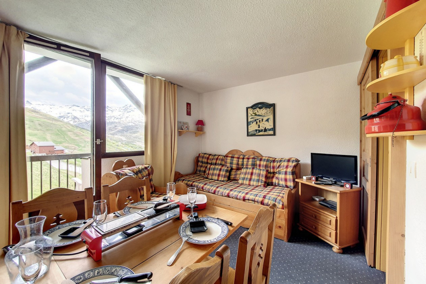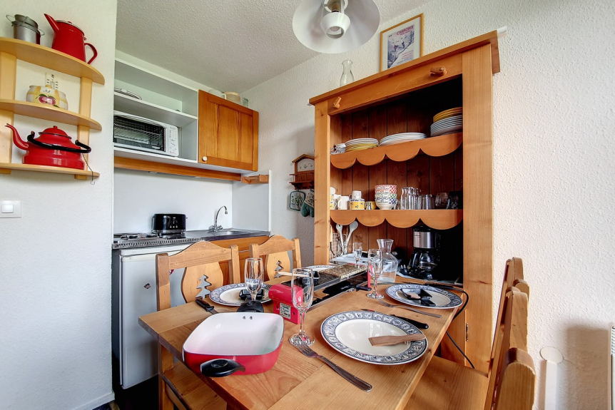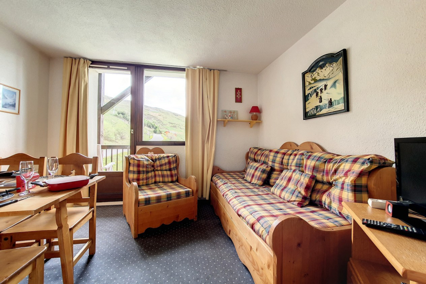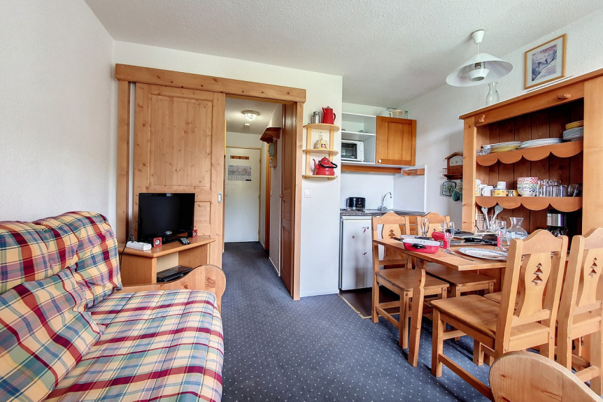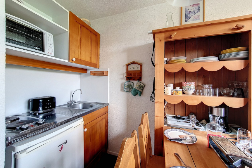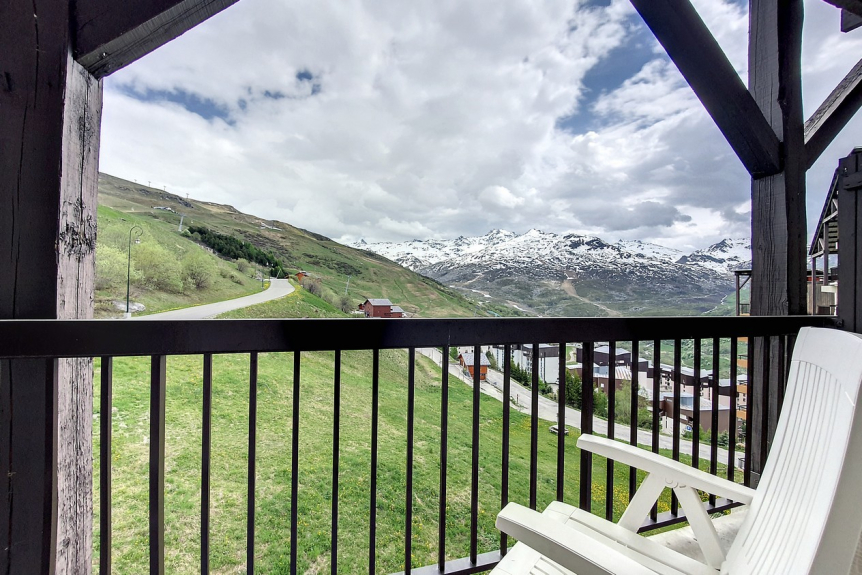 Estudio con rincón de montaña de 18m² para 3 personas, está situado en la 5ª planta con ascensor y tiene un balcón orientado al sureste.