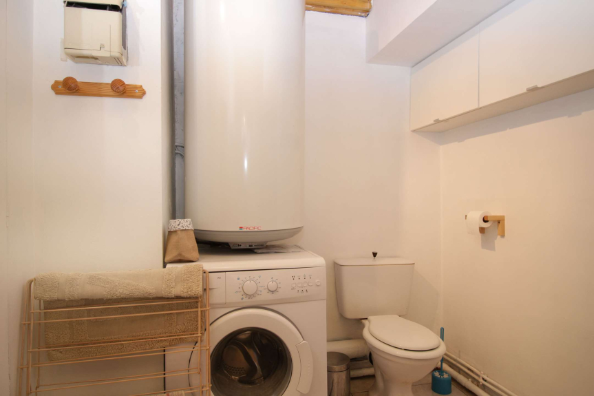 Cuarto de baño (6 m²): lavabo, bañera, lavadora, secador de pelo con inodoro.
