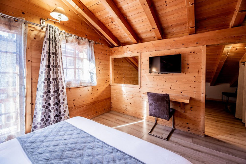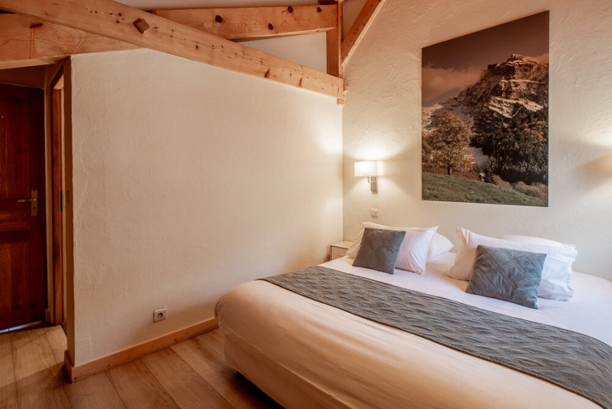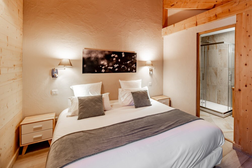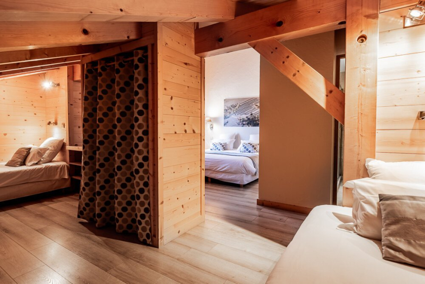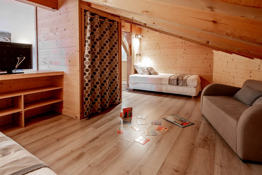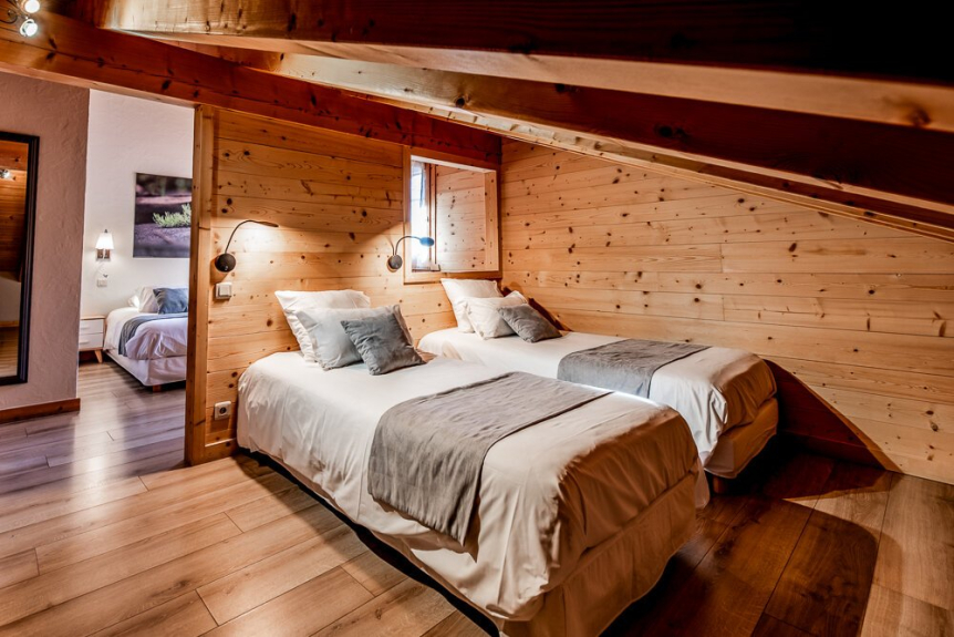 Dormitorio 5: habitación cuádruple de 27 m² con vigas vistas. La habitación principal tiene una cama king-size (o 2 camas individuales) equipada con un televisor de 82 cm, una zona de estudio y un cuarto de baño con ducha y lavabo. La habitación abuhardillada tiene una cama king-size (o 2 camas individuales), un armario con espacio para colgar y estanterías. También tiene un balcón.