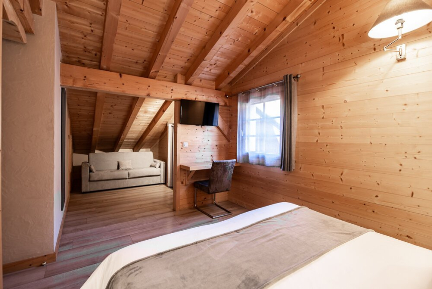 Habitación 3: habitación triple abuhardillada de 21 m² con vigas vistas, compuesta por una cama de matrimonio (o 2 camas individuales) y un sofá cama "rapido" (colchón de 12 cm de grosor 140 x 197 para un adulto o 2 niños pequeños). Está equipada con un televisor de 82 cm, una zona de estudio, un armario con espacio para colgar y estanterías, y un cuarto de baño con ducha y lavabo.