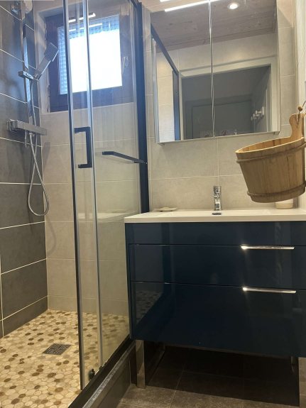 WC separado, cuarto de baño con ducha y lavabo.