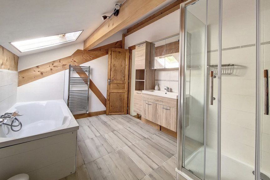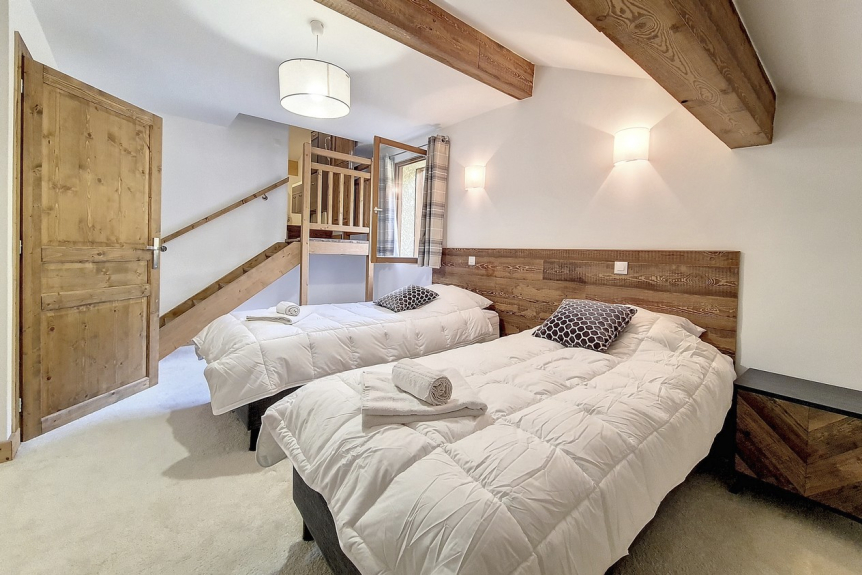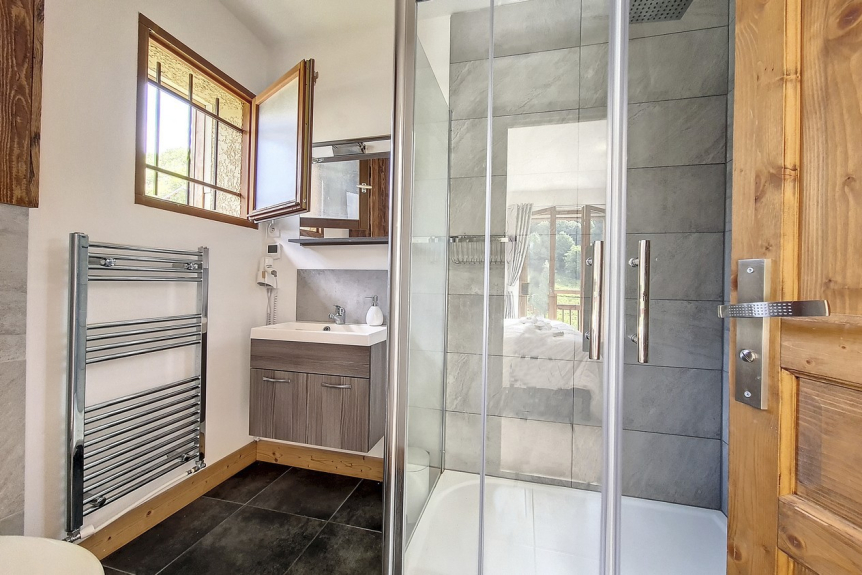 Dormitorio 2 en suite: 2 camas individuales (90x200), cuarto de baño con ducha, lavabo, WC y calentador de toallas y secador de pelo.