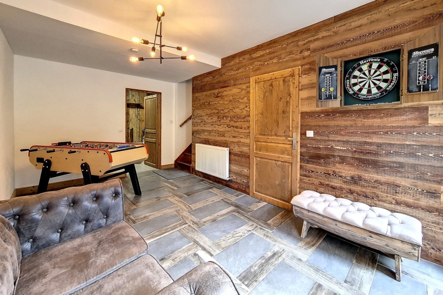 Entrada acondicionada con zona de juegos: futbolín, diana de dardos.