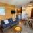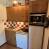 Entrada al salón con balcón orientado al norte/oeste, televisión, sofá cama 2x90, 1 sofá cama 1x90, cocina americana con lavavajillas, mini horno eléctrico, microondas, vitrocerámica de 4 fuegos, frigorífico.