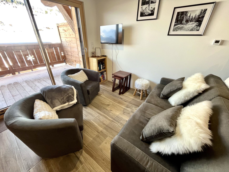 Nuevo piso dúplex de 55 m² para 4 a 6 personas, situado en las plantas 2ª y 3ª de una residencia con ascensor. Dispone de dos terrazas orientadas al noroeste con vistas al Mont Charvin y a las montañas de los alrededores.