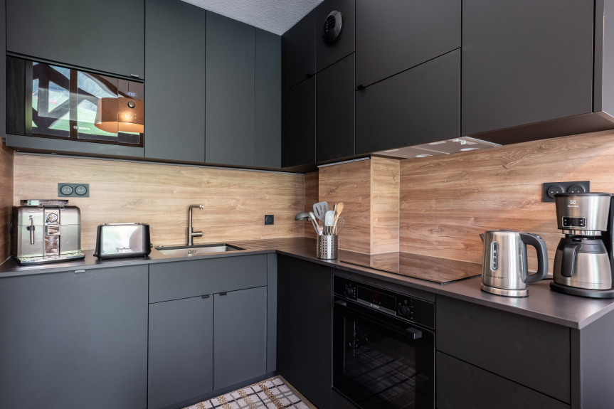 Una cocina americana totalmente renovada con vitrocerámica, frigorífico, horno, microondas, tostadora, lavavajillas, hervidor eléctrico y cafetera,