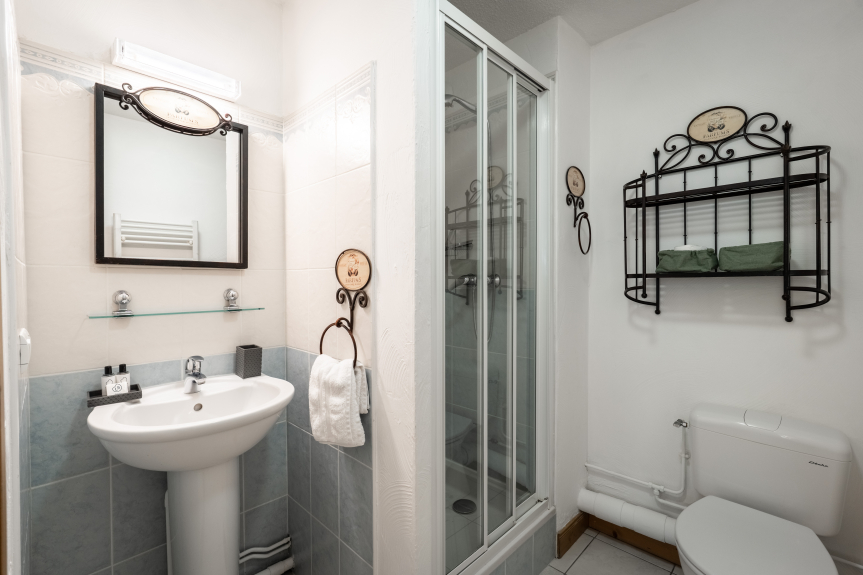 Un dormitorio con cama de matrimonio de 160 cm, cuarto de ducha privado con WC y acceso al balcón.