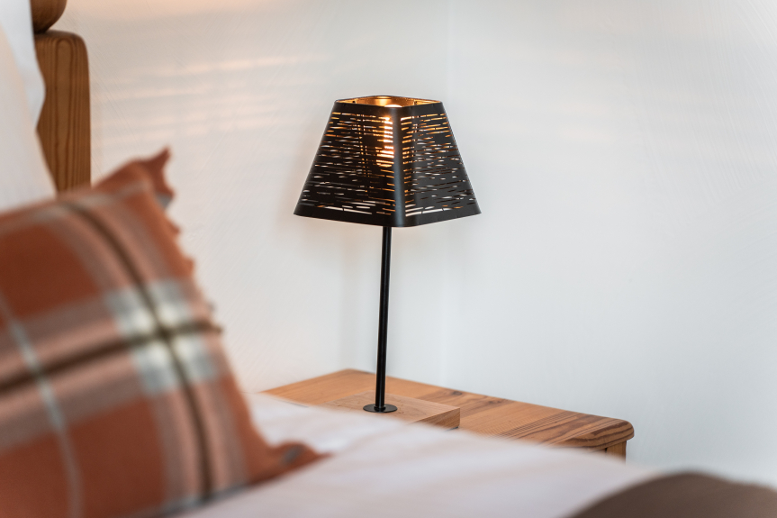 Un dormitorio con una cama doble (160cm), su propio cuarto de ducha con WC y acceso al balcón.